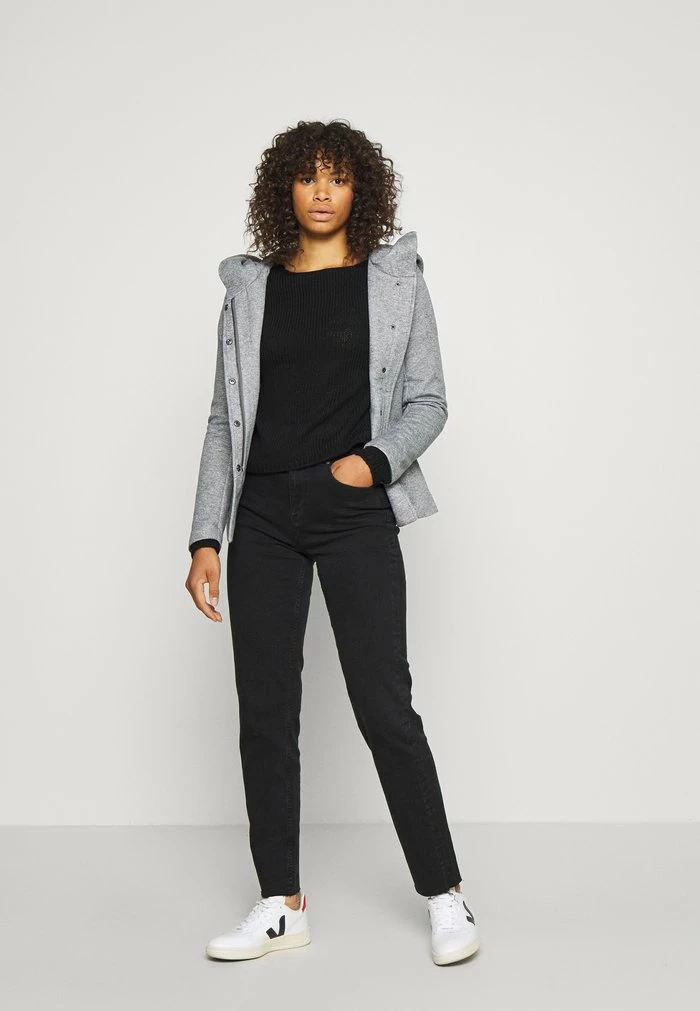- Details: Inseam pockets, shoulder pads, covered fastener